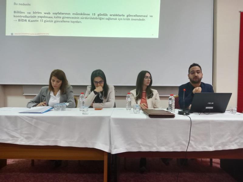 Kalite ve Akreditasyon Ofisi Koodinatörü Dr. Öğr. Üyesi Erman KAÇAR ile Koordinatör Yardımcıları Doç. Dr. Nilcan MERT, Dr. Öğr. Üyesi Tuğba MERT EMİROĞLU ve Dr. Öğr. Üyesi Benazir ÖZTÜRK'ün yönlendirdikleri toplantıda akademik ve idari personelimize bir sunum yapan Dr. Öğr. Üyesi Erman KAÇAR tarafından çalışmaların sürekliliği ve içeriği konularında bilgilendirme yapıldıktan sonra kurumsal akreditasyonun devamlılığı ve çalışmaların işlevselliği vurgulandı.