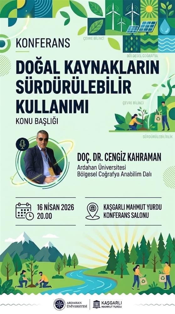 Fakültemiz Coğrafya Bölümü öğretim üyelerinden Doç. Dr. Cengiz Kahraman, 16 Nisan 2026 tarihinde Kaşgarlı Mahmut Yurdu Konferans Salonunda “Doğal Kaynakların Sürdürülebilir Kullanımı” konulu bir konferans vermiştir. Konferansta, sürdürülebilirliğin üç temel bileşeni olan ekonomi, çevre ve toplum perspektifinde doğal kaynakların sürdürülebilir kullanımı, günümüzde global çevre sorunları olarak ön plana çıkan küresel ısınma, iklim değişikliği, ormansızlaşma, çölleşme, sera gazlarında artış, biyolojik çeşitliliğin azalması, su-hava-toprak kirliliği, vb. gibi sorunlar tartışılmış, doğal kaynakların gelecek nesillere sağlıklı bir şekilde ulaştırılması için çözüm önerileri üzerinde durulmuştur.