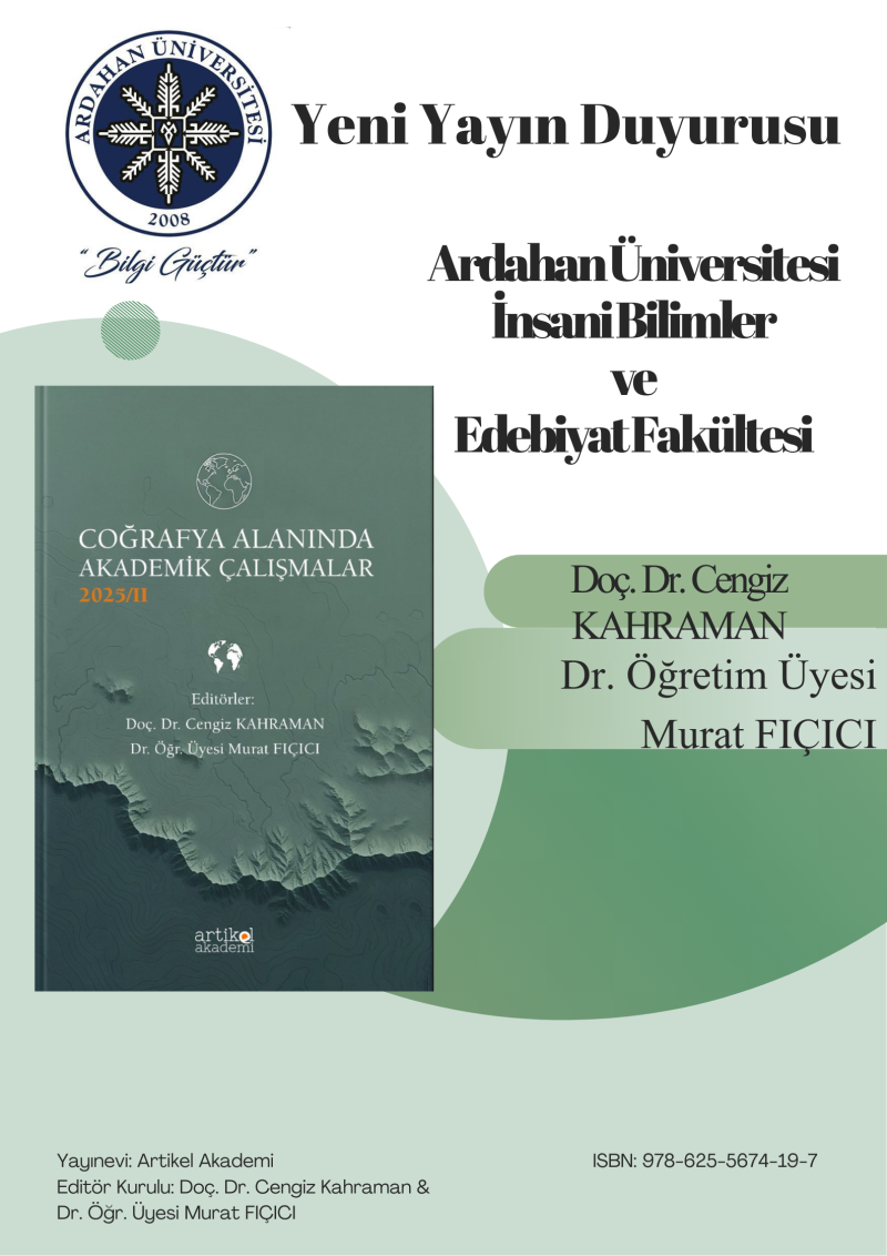 Fakültemiz Coğrafya Bölümü'nden Doç. Dr. Cengiz Kahraman ve Dr. Öğretim Üyesi Murat Fıçıcı'nın editörlüklerini üstlendikleri kitaplar Artikel Yayınları aracılığıyla okurla buluşuyor.